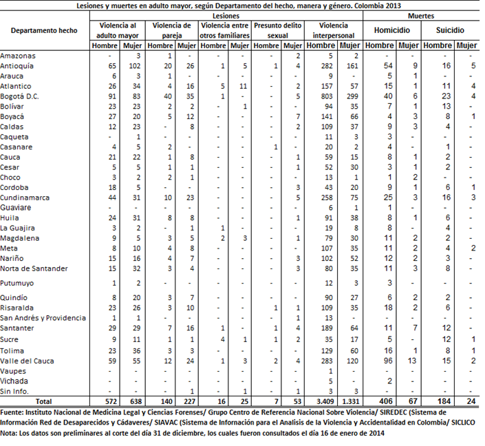 Por su parte, Estadísticas del Instituto Nacional de Medicina Legal y Ciencias Forenses muestran que de las agresiones a las personas mayores, en 2013 se presentaron: 1210 casos de violencia al adulto mayor,337 casos de violencia de pareja, 41 casos de violencia entre otros familiares y 4740 de eventos de violencia interpersonal.