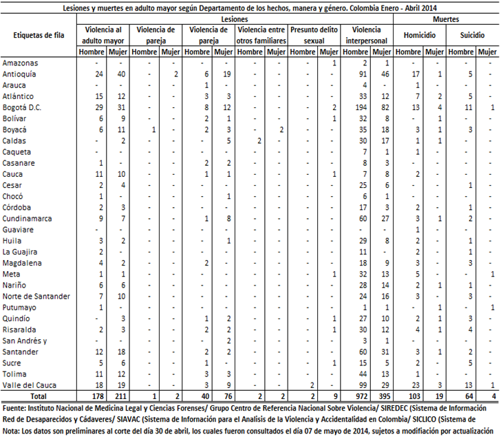 Con relación a la violencia no fatal hacia la persona mayor en el contexto intrafamiliar, las cifras indican que ésta disminuye a medida que la edad avanza, con un mayor número de registros en el rango de edad de 60 a 64 años y el menor en el de 80 y más. Con respecto a las regiones, Valle del Cauca presentó las cifras más altas de homicidio en personas mayores tanto para los años 2013 y de enero a abril del 2014, con 109 y 26 casos respectivamente, seguido por Antioquia y Bogotá (Ver anexos).