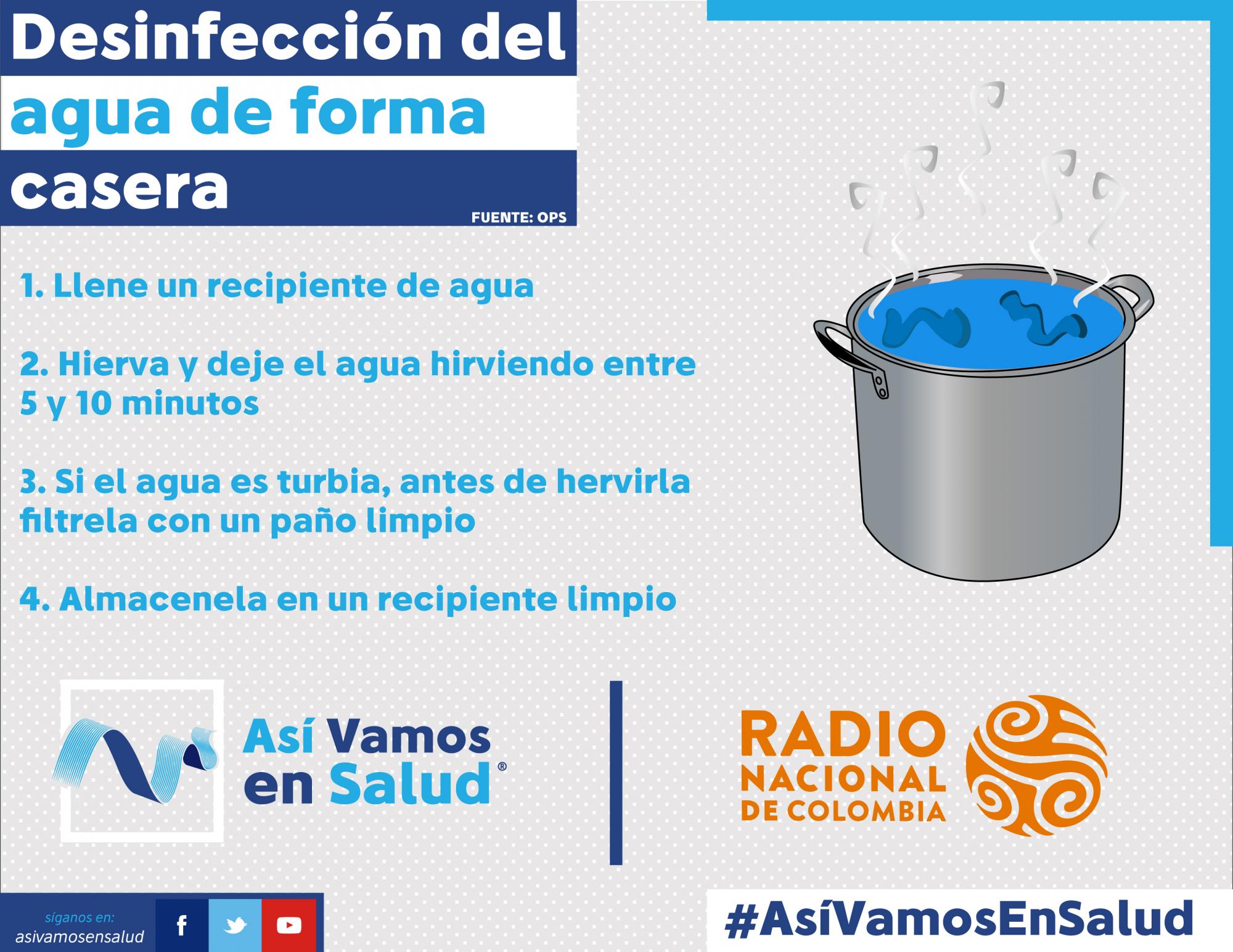 Una acción sencilla como Hervir el agua, es un método bastante efectivo para desinfectar pequeñas cantidades de agua clara. De igual manera, realizar la limpieza y desinfección de los tanques de almacenamiento del agua, garantizan almacenar el líquido en buenas condiciones; por lo cual se recomienda hacer estos procedimientos periódicamente.