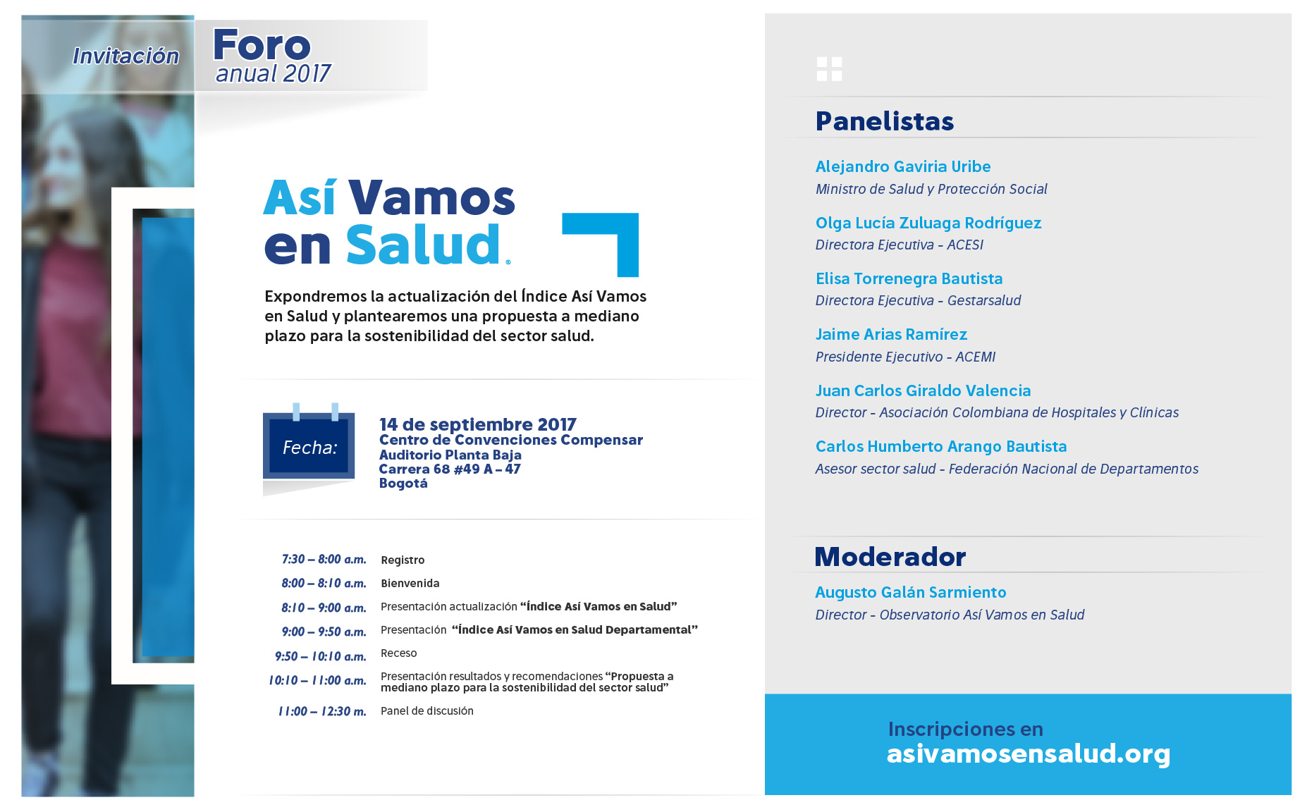 El próximo 14 de septiembre se llevará a cabo el Foro “Así Vamos en Salud”, de 8:00 a.m. a 1:00 p.m., en el Centro de Convenciones Compensar, Auditorio Planta Baja; en la Carrera 68 #49 A – 47, Bogotá.