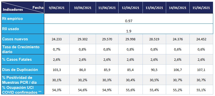 El espacio Information System for the Region of the Americas de la PAHO, muestra el comportamiento del virus a lo largo de las Américas. A la fecha, la PAHO ha reportado 69.8 millones de casos positivos confirmados y un total de 1.8 millones de muertes a lo largo del continente (4). Siendo Estados Unidos el país con más casos positivos confirmados a la fecha con 33.1 millones, seguido de Brasil con 17.4 millones. Por su parte Colombia, a la fecha (15/06/2021), alcanzó un acumulado de 3.777.600 casos confirmados. Lo anterior presupone una tasa crecimiento diario de alrededor del 0,65%. Al igual que hace 15 días, hay un crecimiento de los casos mundiales confirmados de aproximadamente 3.4%, pasando de 170.4 millones a 176.3 millones (5), lo cual representa una disminución importante en el crecimiento de casos.