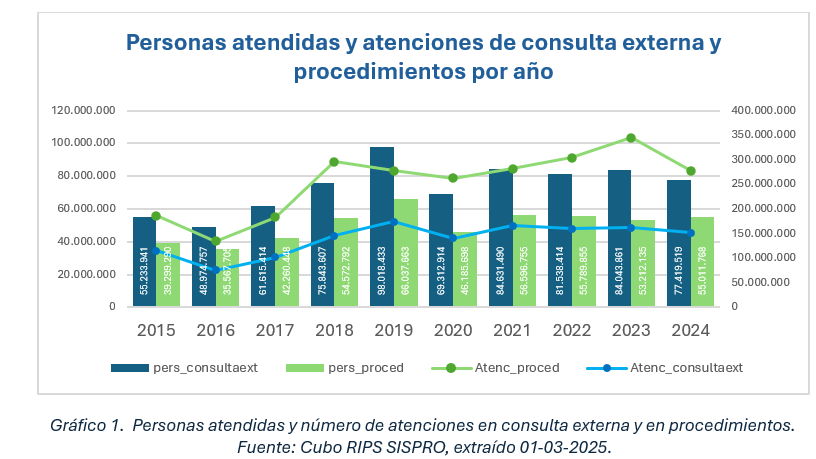 En los datos analizados (ver gráfica 1) se evidencia que tanto el número de personas atendidas como la cantidad total de atenciones en consultas y procedimientos, muestran un incremento sostenido a lo largo de la serie (2015–2024). En todos los años, el número total de atenciones es mayor que el número de personas atendidas, lo que indica que cada persona puede recibir múltiples consultas o procedimientos durante un mismo año. La diferencia entre personas y atenciones se mantiene en crecimiento, lo que sugiere que, además de haber más usuarios, cada uno está accediendo a un promedio mayor (o al menos constante) de servicios de salud. Para 2024 se calculó un promedio de 5 procedimientos por persona, 1 punto menos que el año inmediatamente anterior, mientras que para consulta externa se ha mantenido en los últimos años un promedio de 2 consultas por persona.