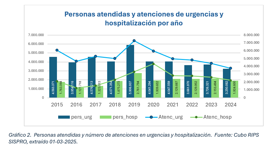 La gráfica 2, revela un pico máximo de urgencias y hospitalizaciones hacia 2019, seguido de una disminución notable con mayor pronunciamiento desde 2022. Esta evolución sugiere que, además de factores coyunturales como la pandemia, el uso de los servicios de urgencias y hospitalización se ve influido por cambios en la demanda, la oferta y la organización del sistema de salud, situación que es clave analizar con mayor detalle, ya que saber las causas de estas fluctuaciones permitirá optimizar la planificación y el uso de recursos en la atención hospitalaria y de urgencias.