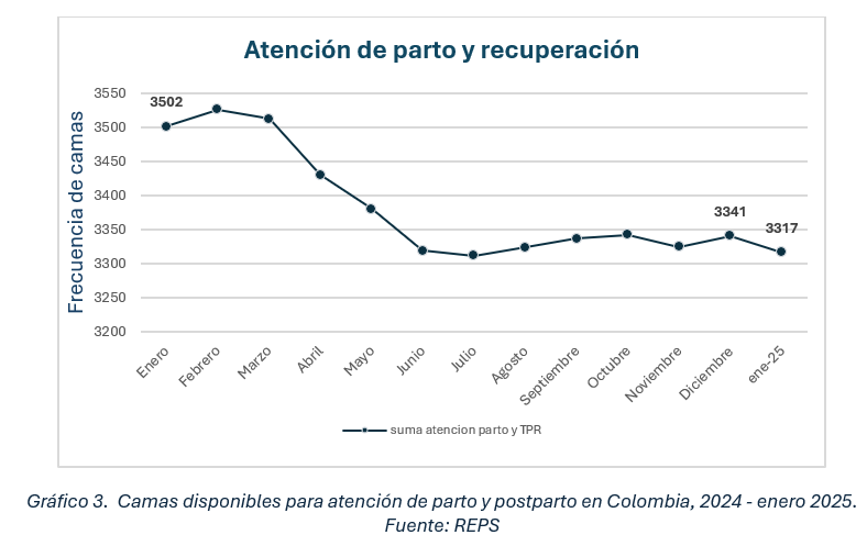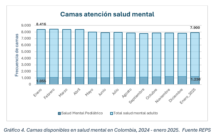 Sin embargo, la entidad facilitó un reporte de resultados mensuales en el año 2024, en el que se evidencia una disminución de camas de atención de parto y recuperación, desde enero 2024 a enero de 2025 (-161 camas, ver gráfico 3), al igual que en salud mental adulto (-516 camas, ver gráfico 4). Este descenso podría atribuirse a diversos factores (cambios en la demanda de servicios, estacionalidad, políticas de salud, etc.), pero con la información disponible no es posible confirmar la tendencia a la baja en estos servicios ni tampoco sus causas. De acuerdo con este reporte se cerraron unas camas pediátricas, pero se abrieron otras.