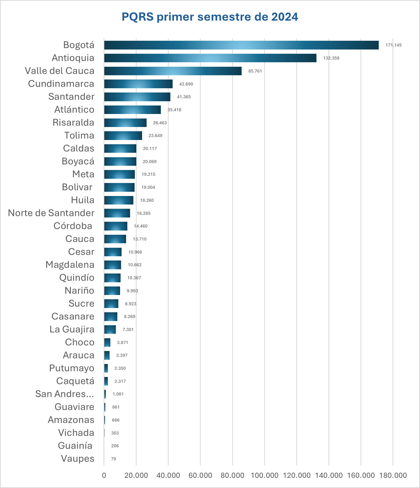 Gráfico 4. PQRS interpuestas en el primer semestre de 2024, desagregado por nivel departamental. Fuente: Superintendencia de salud.