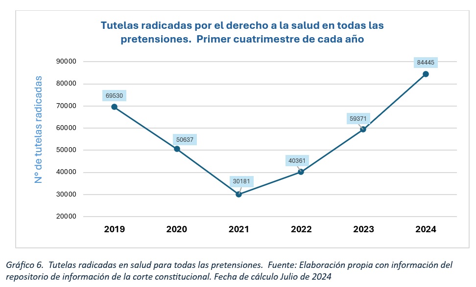 En la actualidad, La Corte Constitucional cuenta con un tablero de estadísticas en el cual se realiza seguimiento, entre otros temas, a las tutelas que establecen los ciudadanos buscando que se les garantice el derecho a la salud. Esta información permite analizar el comportamiento de las tutelas y las pretensiones reclamadas en los últimos años. El corte de información se encuentra a abril de 2024, por lo cual, se analiza la información del primer cuatrimestre de cada año en forma comparativa.