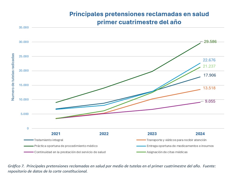 De las 22 pretensiones que agrupan las tutelas en salud, 6 de estas concentran la mayoría de las solicitudes realizadas por los usuarios del sistema.  La práctica oportuna de procedimientos médicos se constituye como la primera causa de radicación de tutelas en el periodo de análisis pasando de 9.004 acciones en 2021 a 29,586 en 2024, con mayor pronunciamiento de la pendiente desde el año inmediatamente anterior (2023), comportamiento que se replica en las demás reclamaciones.  A esta pretensión le sigue la entrega oportuna de medicamentos e insumos y la asignación de citas médicas, evidenciando deterioro en la oportunidad de acceso a los servicios, procedimientos e insumos que los usuarios del sistema necesitan para el cuidado de su salud, lo cual, es coherente con las quejas que los pacientes manifiestan abiertamente por las diferentes vías de comunicación, de igual forma, la garantía del  tratamiento integral, el suministro de servicio de  transporte y viáticos para recibir atención y la continuidad en la prestación del servicio de salud, suponen un deterioro en la integralidad del acceso.