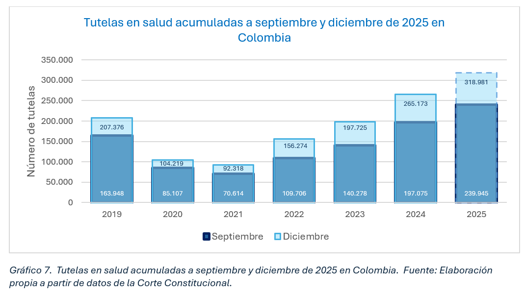 Al analizar las cifras de tutelas acumuladas en lo corrido del año, con base en el último reporte disponible de la Corte Constitucional (corte a septiembre), se observa un incremento sostenido, con un pico significativo en el mes de julio (32.414 tutelas). Este comportamiento guarda similitud con el patrón identificado en las PQRS interpuestas durante el mismo periodo. Aunque en agosto se registró una leve disminución (27.118 tutelas), en septiembre las cifras volvieron a aumentar (30.173 tutelas), ubicándose muy por encima del promedio anual. Si esta tendencia se mantiene y se conserva el ritmo de crecimiento observado entre septiembre y diciembre, se proyecta que para el cierre de 2025 se habrán registrado aproximadamente 318.981 tutelas (ver gráfico 7). Esta estimación coincide con la advertencia realizada por la Defensoría del Pueblo el pasado 6 de noviembre, que proyecta un total cercano a las 314.658 tutelas para diciembre.