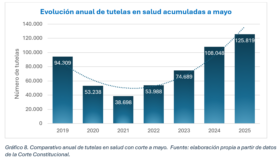 En 2025, el número de tutelas en salud acumuladas hasta mayo registró un incremento importante frente al mismo periodo de 2024, al alcanzar 125.819 casos, lo que representa un aumento del 16,4%, variación porcentual menor a la registrada en el año inmediatamente anterior con respecto a 2023 (ver gráfico 8). El aumento continuo que se registra en los datos analizados muestra fallas estructurales en el sistema generados por la negación de servicios, falta de oportunidad en la atención y deficiencia en los trámites administrativos.