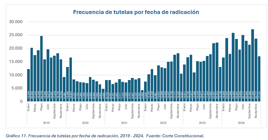 Los datos emitidos por la Corte Constitucional muestran un comportamiento variable en la radicación de tutelas a lo largo de los años. En 2020, se registró una caída significativa, seguida de una recuperación progresiva desde 2021 y un crecimiento sostenido en 2023 y 2024. Este incremento sugiere una mayor demanda de este recurso legal, posiblemente debido a deficiencias en la prestación de servicios de salud y la vulneración de otros derechos fundamentales (ver gráfico 11).